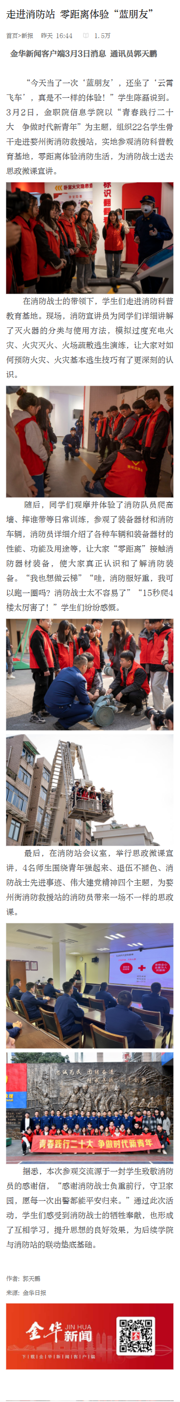 “今天当了一次‘蓝朋友’,还坐了‘云霄飞车’,真是不一样的体验!”学生陈磊说到。3月2日,金职院信息学院以“青春践行二十大 争做时代新青年”为主题,组织22名学生骨干走进婺州街消防救援站,实地参观消防科普教育基地,零距离体验消防生活,为消防战士送去思政微课宣讲。