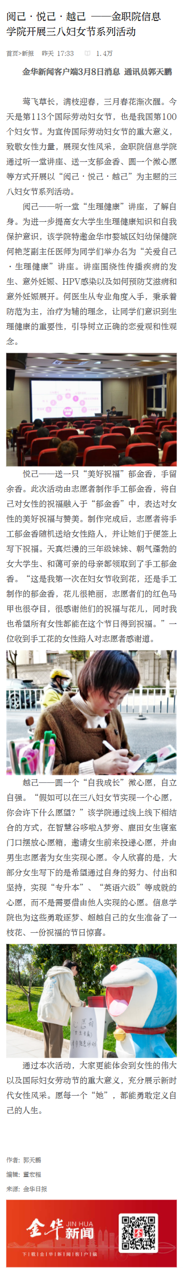 莺飞草长,满枝迎春,三月春花渐次醒。今天是第113个国际劳动妇女节,也是我国第100个妇女节。为宣传国际劳动妇女节的重大意义,致敬女性力量,展现女性风采,金职院信息学院通过听一堂讲座、送一支郁金香、圆一个微心愿等方式开展以“阅己・悦己・越己”为主题的三八妇女节系列活动。