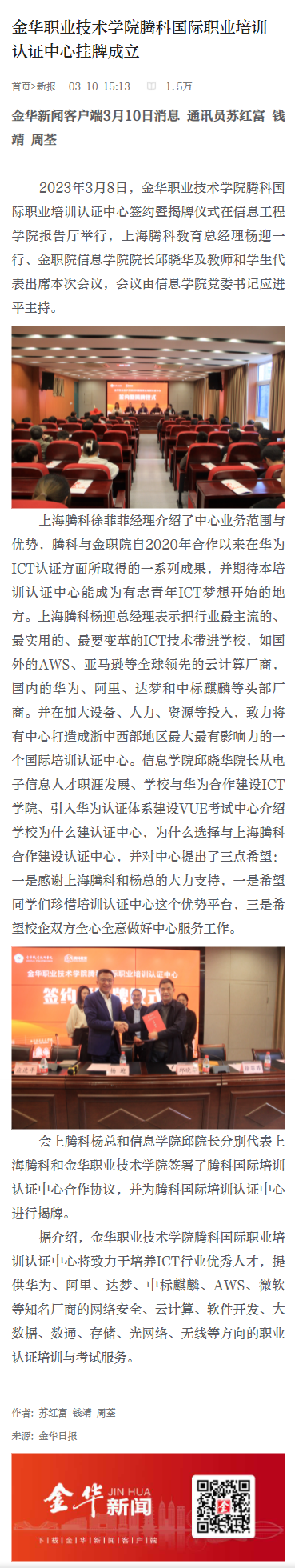【金华新闻客户端】金华职业技术学院腾科国际职业培训认证中心挂牌成立