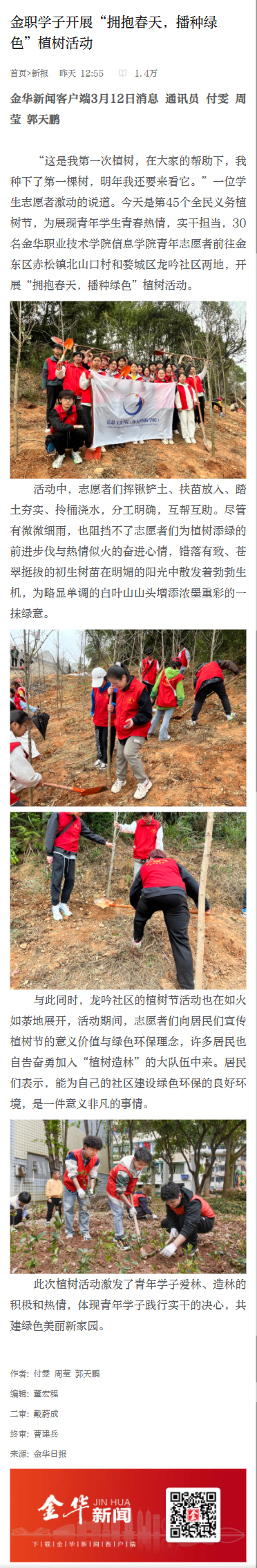 “这是我第一次植树,在大家的帮助下,我种下了第一棵树,明年我还要来看它。”一位学生志愿者激动的说道。今天是第45个全民义务植树节,为展现青年学生青春热情,实干担当,30名金华职业技术学院信息学院青年志愿者前往金东区赤松镇北山口村和婺城区龙吟社区两地,开展“拥抱春天,播种绿色”植树活动。