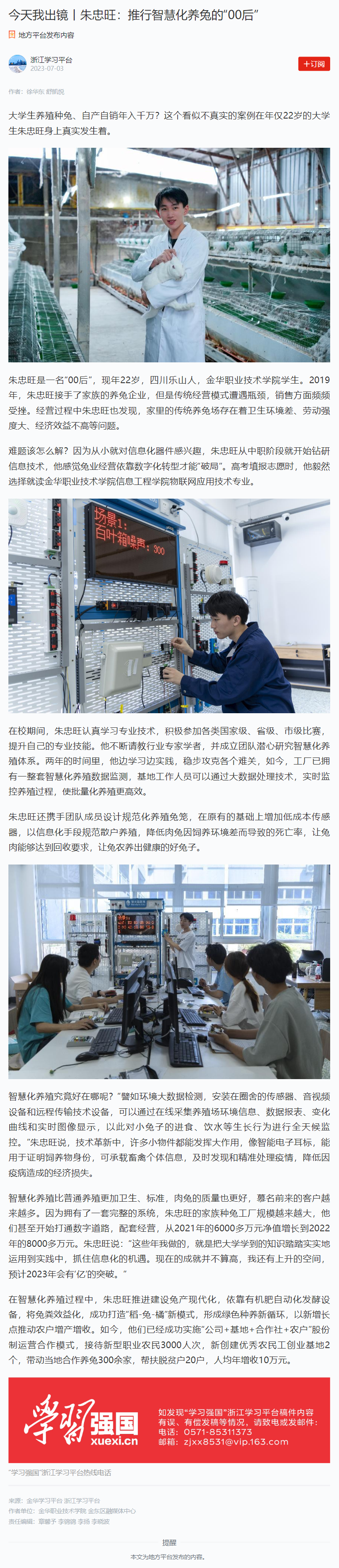 【“学习强国”浙江学习平台】今天我出镜丨朱忠旺:推行智慧化养兔的“00后”