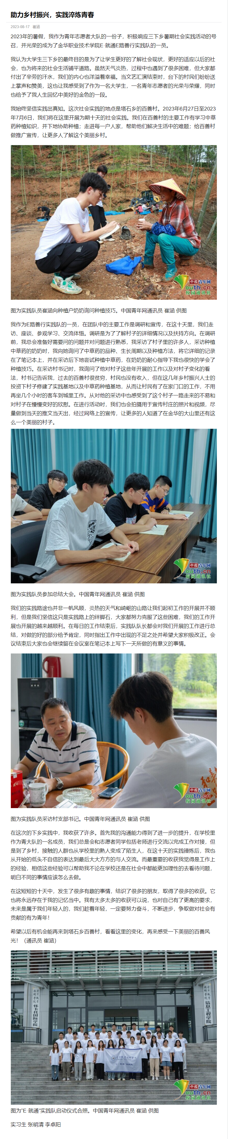 2023年的暑假,我作为青年志愿者大队的一份子,积极响应三下乡暑期社会实践活动的号召,并光荣的成为了金华职业技术学院E·就通E路善行实践队的一员。