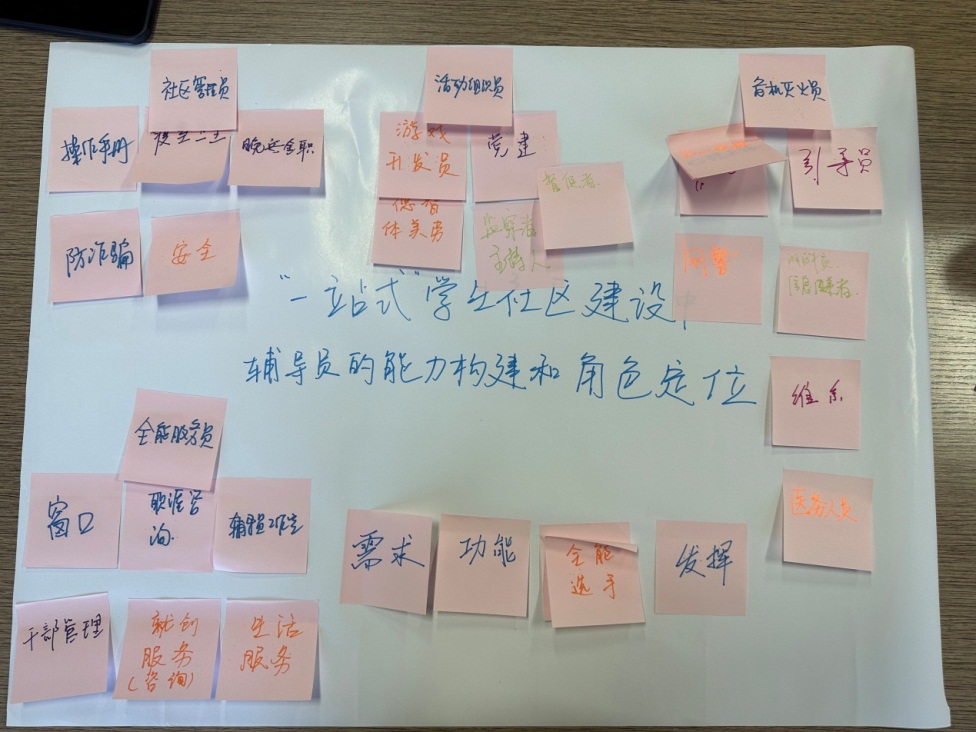 随后,工作室围绕“一站式”学生社区建设中辅导员的能力构建和角色定位开始了第十九期的设计思维工作坊活动。通过工作室辅导员的头脑风暴,将“一站式”学生社区中辅导员的角色定位主要分为五类,即思想引导员、社区管理员、活动组织员、全能服务员、危机灭火员。杨炉飞老师还对未来“一站式”学生社区提出建议,探索“窗口”模式,从学生需求出发,设置固定窗口,发挥服务功能,为学生提供更加便捷、贴心的帮助。