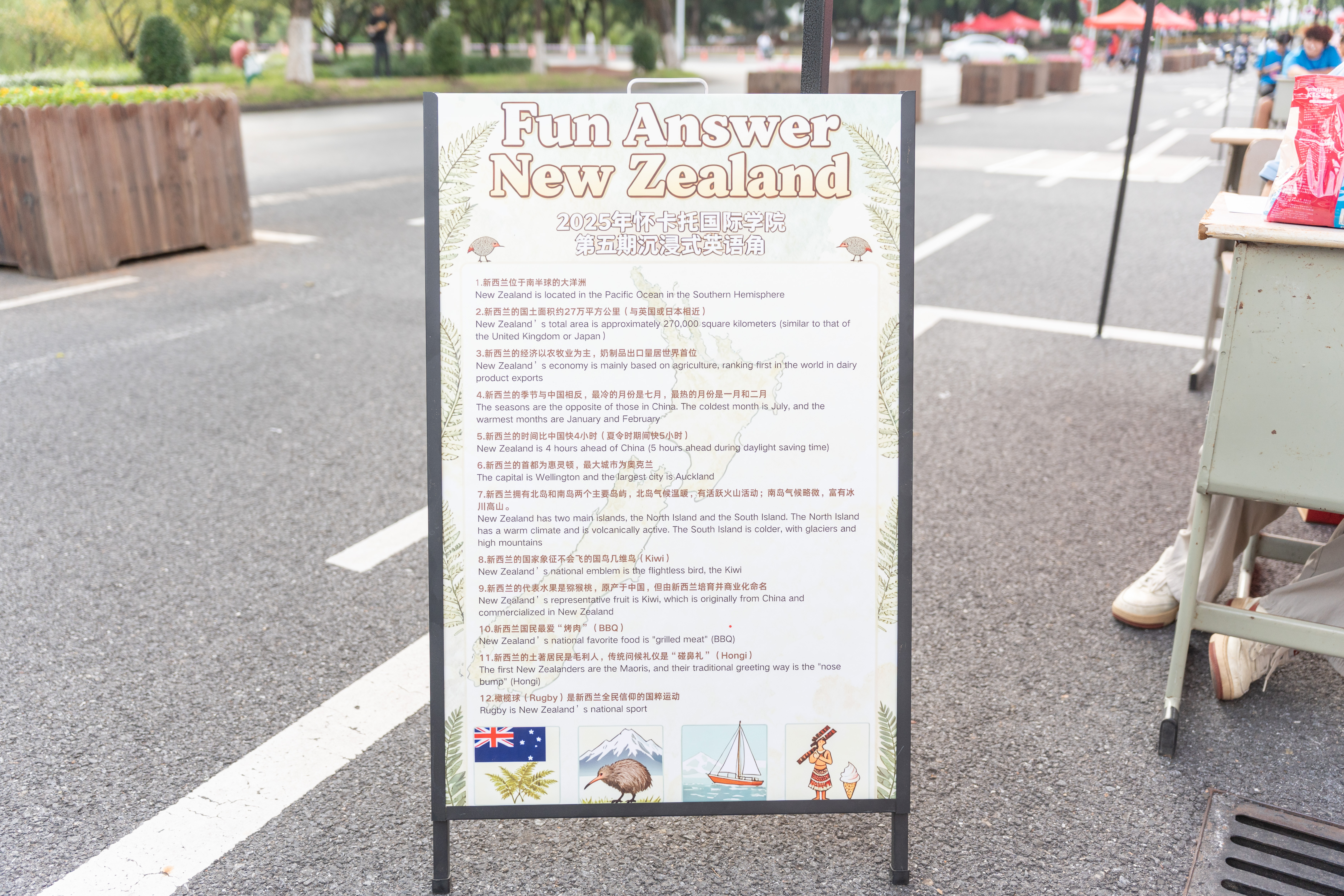 活动现场布置了丰富多彩的双语展示牌,生动介绍新西兰风土人情与文化知识。新生们通过学习知识、抽取盲盒、英文问答参与互动,每答对一题即可获得新西兰特色文创纪念品。在趣味知识竞赛中,同学们不仅锻炼了英语理解和表达能力,也潜移默化地加深了对新西兰的了解。