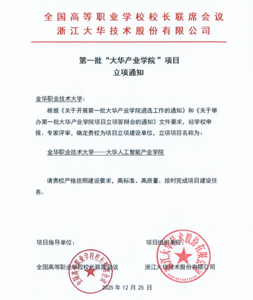 12月25 日,金华职业技术大学申报的“大华人工智能产业学院”项目,经全国高等职业学校校长联席会议与浙江大华技术股份有限公司联合评审,正式获批成为首批立项建设单位。这一成果标志着该校在深化产教融合、服务区域人工智能产业发展进程中迈出了关键的一步。