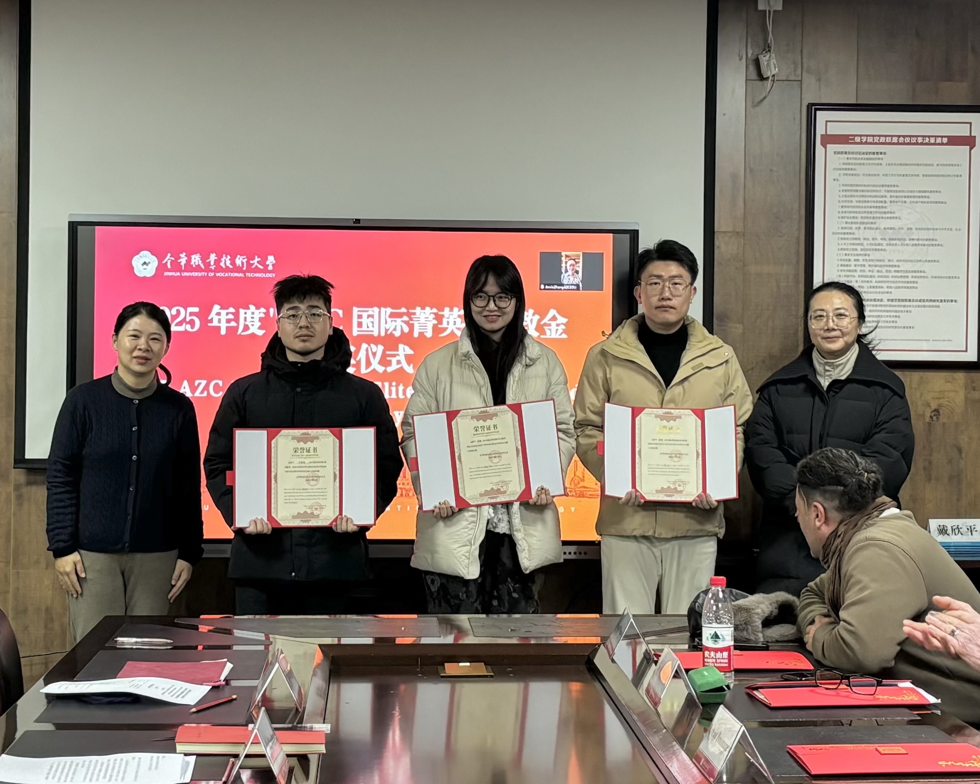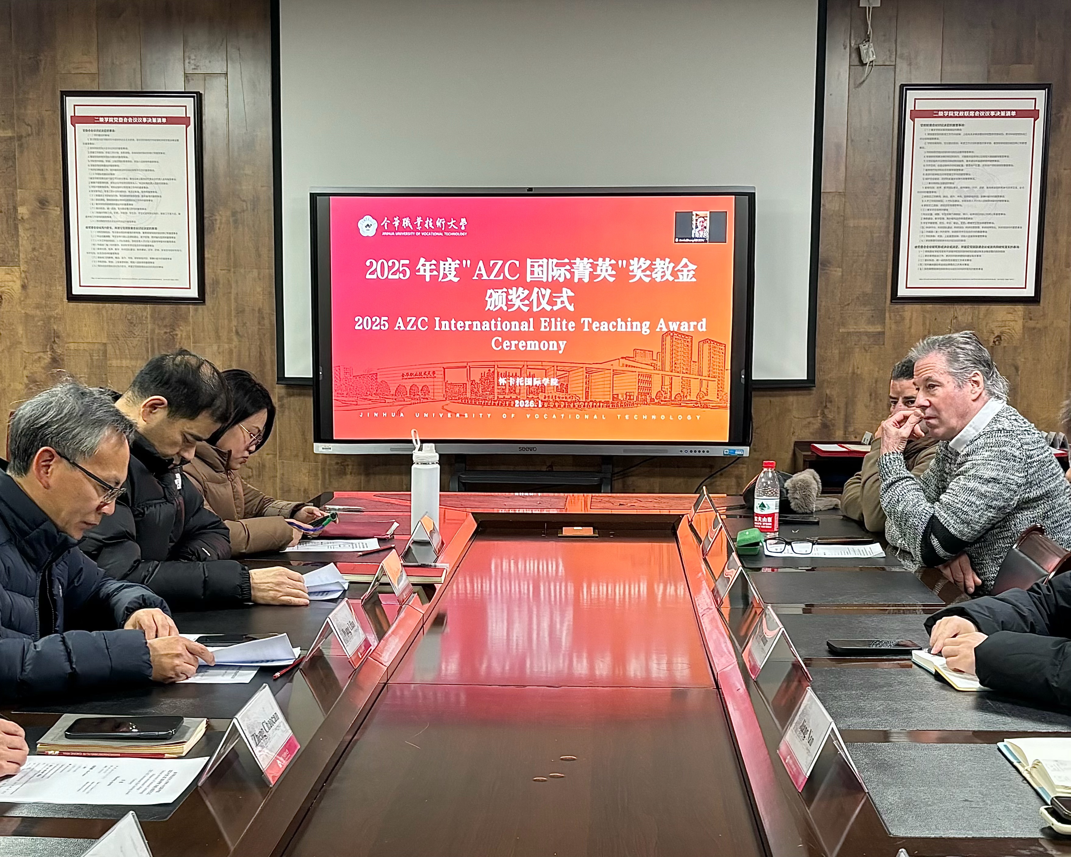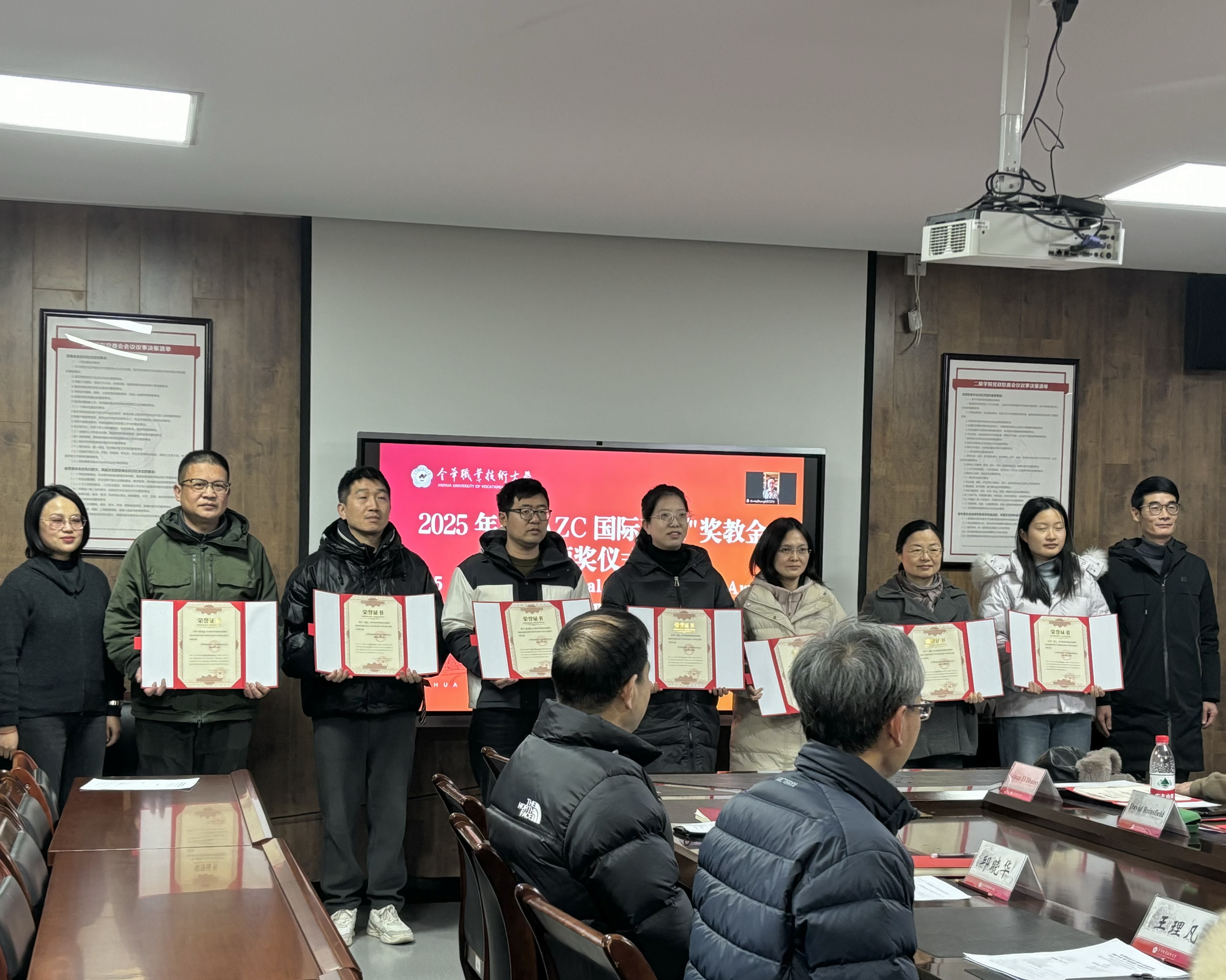 为表彰在国际化教学、科研与交流中作出卓越贡献的教职人员,进一步推动中外合作办学事业的高质量发展,近日,怀卡托国际学院2025年度“AZC国际菁英”奖教金颁奖仪式在216会议室举行。AZC国际教育交流中心代表张恩宁女士以视频方式远程参与,学校教育发展基金会理事长王理凡,信息工程学院、设计学院党政班子成员及获奖教师共同出席了仪式,见证这一荣誉时刻。