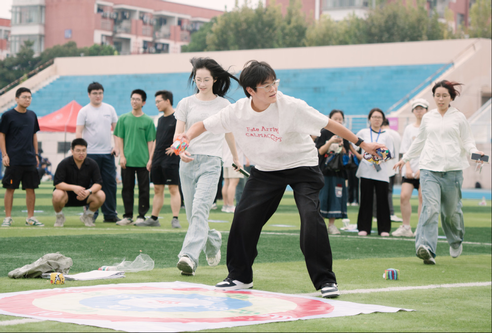 趣味运动添欢乐,团队协作凝合力。除了紧张激烈的竞技项目,趣味运动环节同样精彩纷呈,成为运动会的“欢乐源泉”。篮球接力、四人五足、定点沙包等趣味项目,吸引了学院共47支队伍参与。赛场上,队员们相互配合、默契协作:篮球接力时快速传递、精准投篮,四人五足比赛里互帮互助、稳步向前,定点沙包比赛屏气投掷,稳中求胜。同学们在欢声笑语中尽情挥洒汗水,不仅缓解了日常学习的压力,更在协作中加深了彼此的友谊与信任,有效培养了团队凝聚力、自信心、抗挫能力以及积极应对挑战的良好心态。