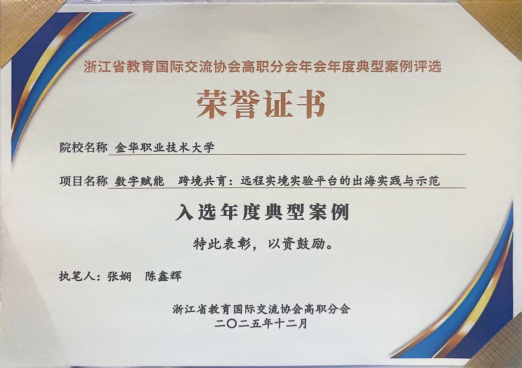 近日,浙江省教育国际交流协会高职分会年会年度典型案例评选结果正式公布。我院张娴副院长与陈鑫辉老师共同执笔的《数字赋能 跨境共育:远程实境实验平台的出海实践与示范》案例成功入选年度典型案例,这标志着我院在职业教育国际化与数字赋能教育融合领域的实践探索获得了省级行业协会的高度认可。该案例聚焦职业教育国际化进程中“跨境实训场景缺失、跨文化协同不畅、个性化指导不足”等核心痛点,创新性地构建了“数字赋能+跨境共育”远程实境实验教学体系。体系以数字孪生技术为核心支撑,结合5G+RTC实时传输模块与自研智能终端,实现对跨境实训全过程的精准复刻与数据同步,融合操作视频、设备参数与跨文化反馈的多模态数据,运用A